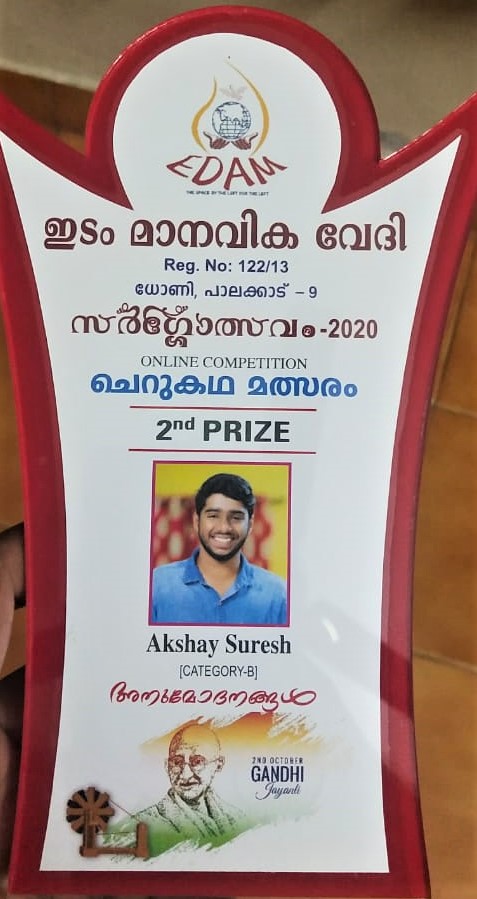 ഗാന്ധി ജയന്തിയോടനുബന്ധിച്ച് ഇടം മാനവിക വേദി, പാലക്കാട് , സംഘടിപ്പിച്ച ചെറുകഥാ മത്സരത്തിൽ അക്ഷയ് സുരേഷ് രണ്ടാം സമ്മാനം നേടി.