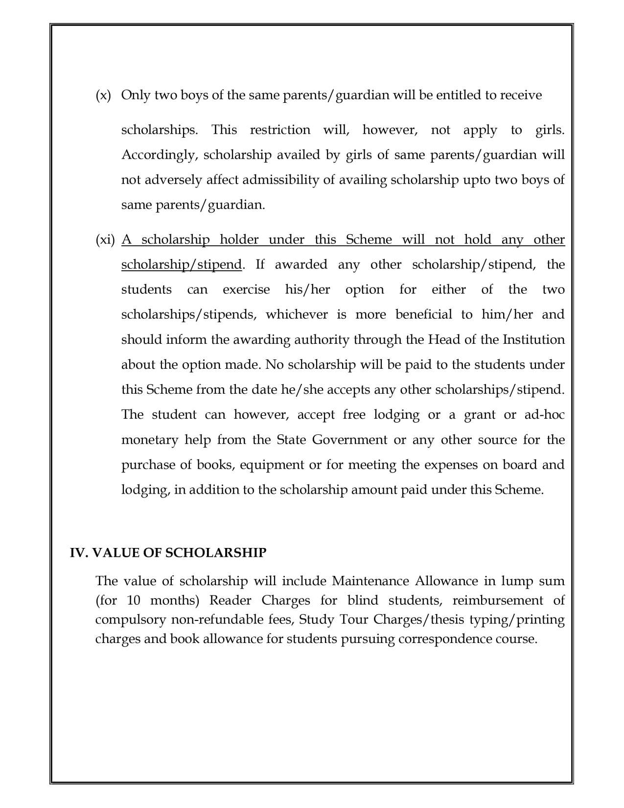 - ഒരു മാതാപിതാക്കളുടെ രണ്ട് ആൺകുട്ടികൾക്ക് മാത്രം ലഭ്യം. പെൺകുട്ടികൾക്ക് പരിധിയില്ല.