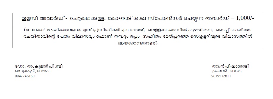 "വേറിട്ടൊരു പിറന്നാൾ മധുരവുമായി ഇരട്ട സഹോദരി പിഷാരസ്യാർമാർ"തുളസീദളം കെ പി നാരായണപിഷാരോടി പ്രഥമ പുരസ്കാര ജേതാവ് ശ്രീ സി രാധാകൃഷ്ണന്റെ അസൗകര്യം മൂലമുള്ള പ്രത്യേക അഭ്യർത്ഥനയെ മാനിച്ചു കൊണ്ട് 2024 ജൂൺ 2 നു നടത്താൻ നിശ്ചയിച്ചിരുന്ന തുളസീദളം അവാർഡ് സമർപ്പണ ചടങ്ങ് മാറ്റി വെക്കുവാൻ 20-5-24നു കൂടിയ കേന്ദ്ര നിർവ്വാഹക സമിതിയും തുളസീദളം പത്രാധിപ സമിതിയും കൂടി ചേർന്ന യോഗം തീരുമാനിച്ചു.