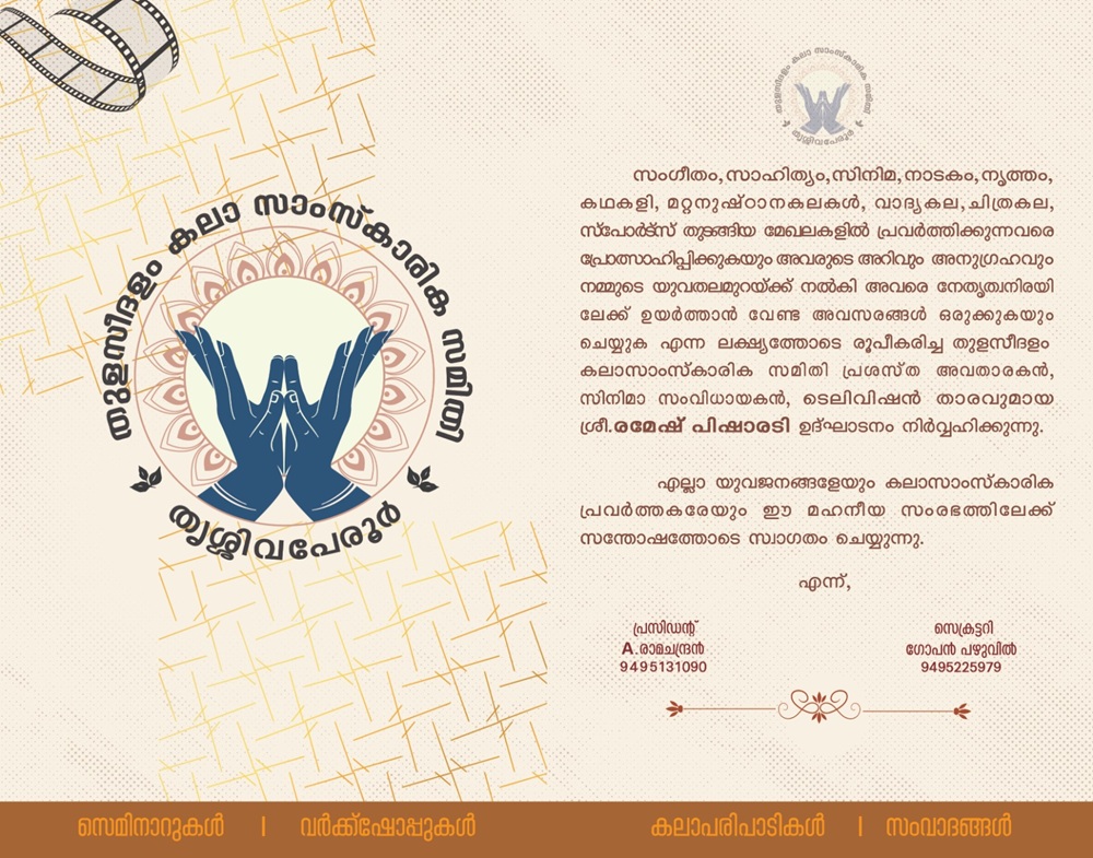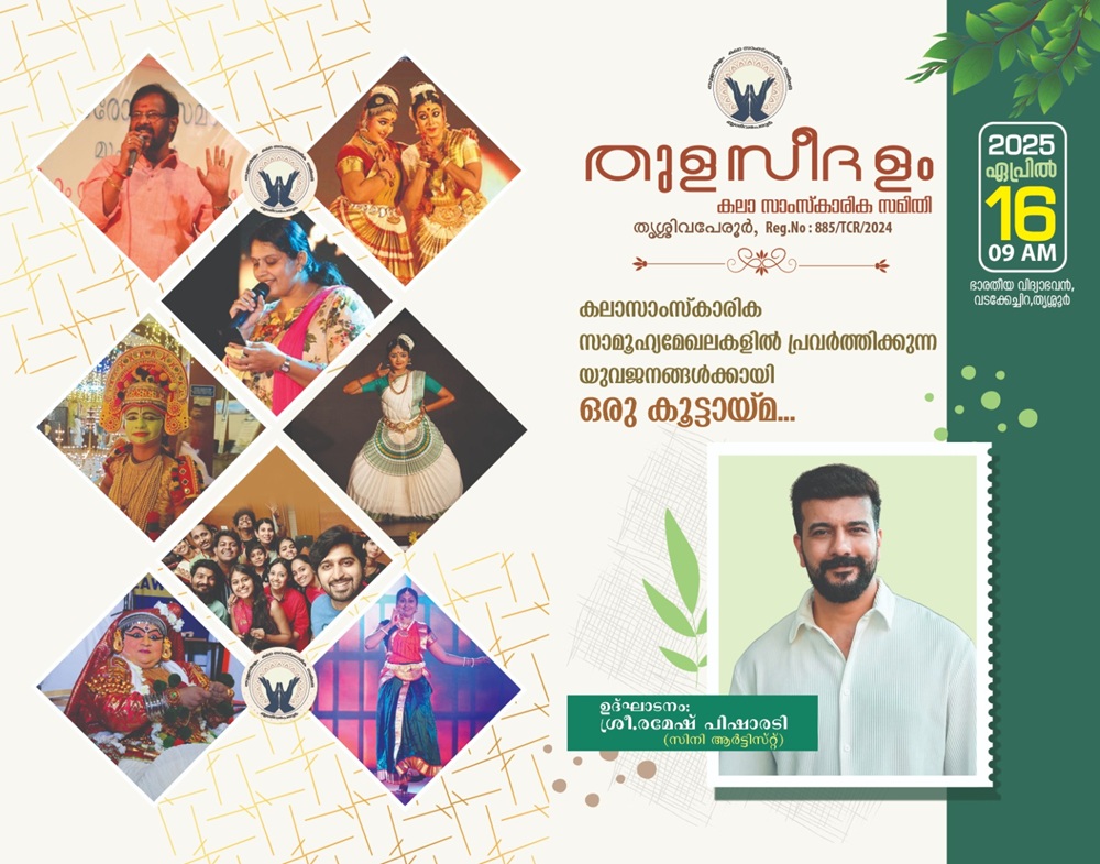സംഗീതം, സാഹിത്യം, സിനിമ, നാടകം, നൃത്തം, കഥകളി, മറ്റനുഷ്ഠാനകലകൾ, വാദ്യകല, ചിത്രകല, സ്പോർട്സ് തുടങ്ങിയ മേഖലകളിൽ പ്രവർത്തിക്കുന്നവരെ പ്രോത്സാഹിപ്പിക്കുകയും അവരുടെ അറിവും അനുഗ്രഹവും നമ്മുടെ യുവതലമുറയ്ക്ക് നൽകി അവരെ നേതൃത്വനിരയിലേക്ക് ഉയർത്താൻ വേണ്ട അവസരങ്ങൾ ഒരുക്കുകയും ചെയ്യുക എന്ന ലക്ഷ്യത്തോടെ രൂപീകരിച്ച തുളസീദളം കലാസാംസ്കാരിക സമിതിയുടെ ഉദ്ഘാടനം പ്രശസ്ത അവതാരകനും, സിനിമാ സംവിധായകനും, ടെലിവിഷൻ താരവുമായ ശ്രീ.രമേഷ് പിഷാരടി 2025 ഏപ്രിൽ 16നു രാവിലെ 9 മണിക്ക് തൃശൂർ വടക്കേച്ചിറ ഭാരതീയ വിദ്യാഭവൻ ഹാളിൽ വെച്ച് നിർവ്വഹിക്കുന്നു.