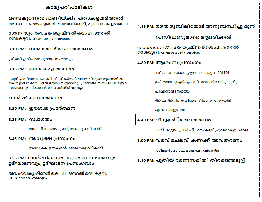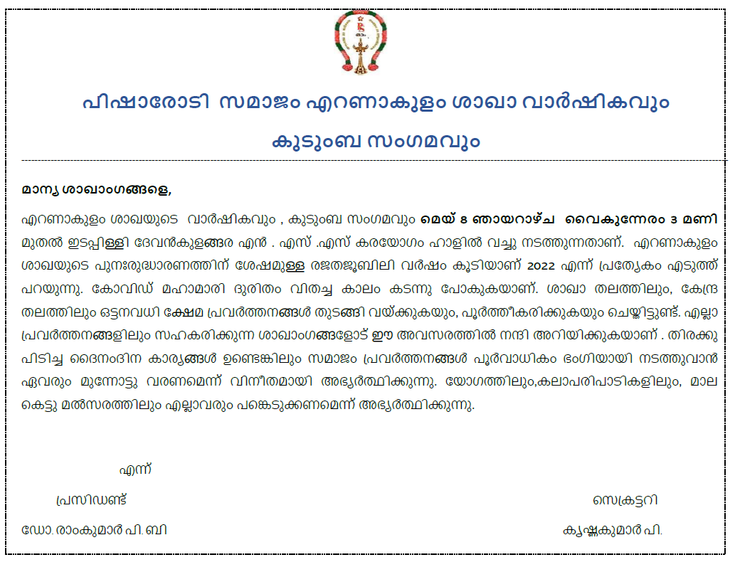 എറണാകുളം ശാഖാ വാർഷികവും കുടുംബ സംഗമവും മെയ് 8 ഞായറാഴ്ച 3 PM നു ഇടപ്പള്ളി ദേവൻകുളങ്ങര NSS കരയോഗം ഹാളിൽ വെച്ച് നടത്തുന്നു.