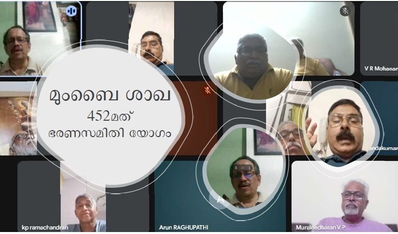 മുംബൈ ശാഖയുടെ 452മത് ഭരണസമിതി യോഗം 14.09.2025നു 5.30 P. Mനു വീഡിയോ കോൺഫറൻസ് വഴി പ്രസിഡണ്ട് ശ്രീ എ പി രഘുപതിയുടെ ആദ്ധ്യക്ഷത്തിൽ കൂടി.